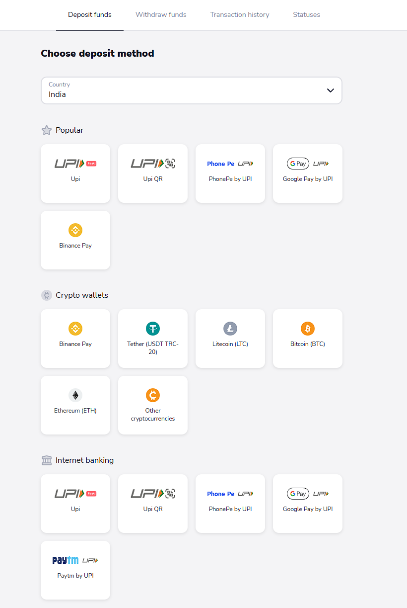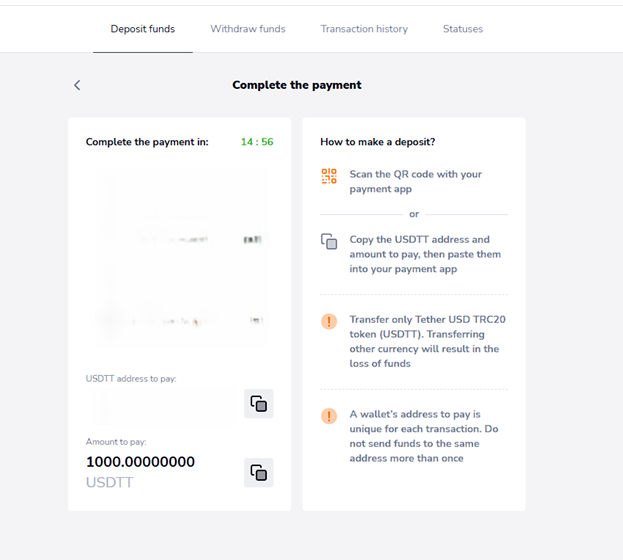 Important: Make sure that the cryptocurrency you deposit matches the one indicated in the "Payment address" field.