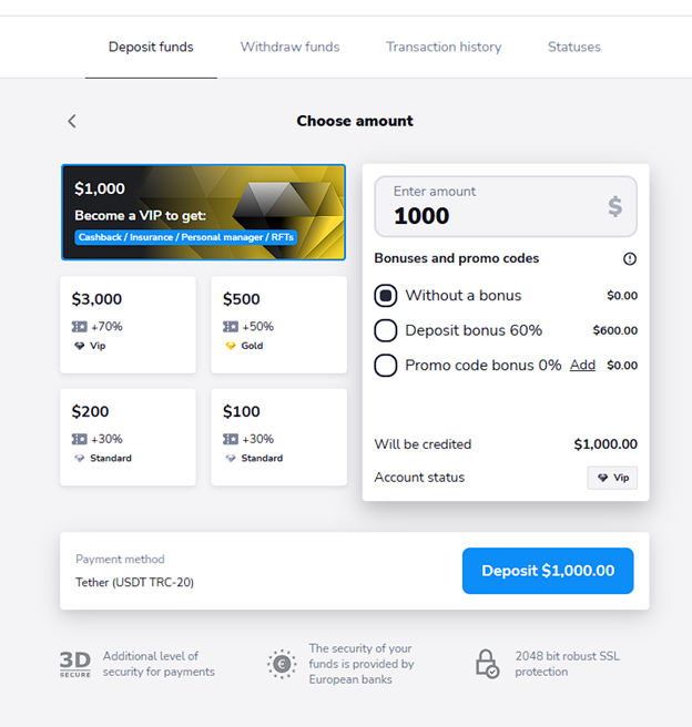 - In the traderoom, click the “Deposit” button in the top right corner of the screen. Choose your country and the payment method you’ve decided to make a deposit with.
