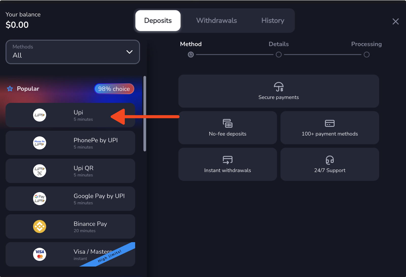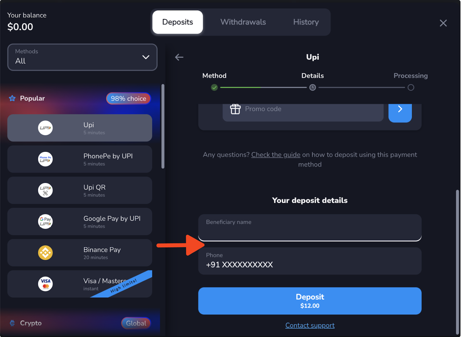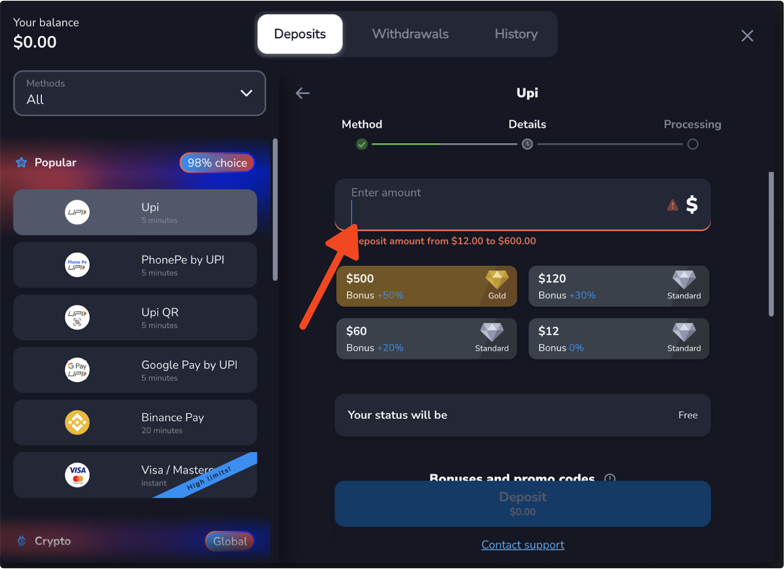 - In the traderoom, click the “Deposit” button (top right). Choose the payment method (UPI).