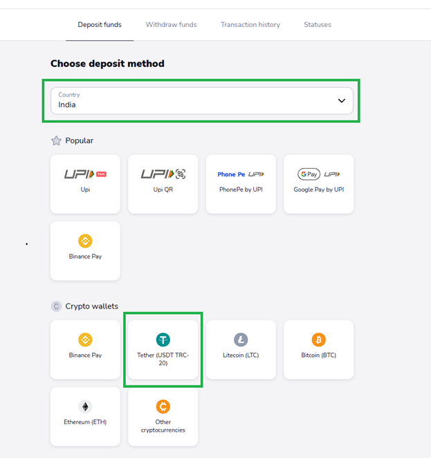 Asegúrese de realizar el depósito con el token Tether USD TRC20 (USDTT). También se especifica en la factura (paso 4). De lo contrario, no será posible obtener un reembolso.
