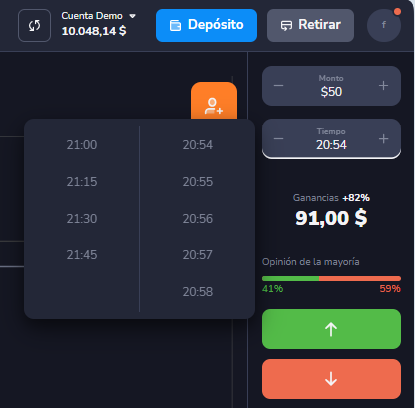 Ejemplo. Si selecciona las 15:45 como tiempo de expiración, la operación se cerrará exactamente a las 15:45.
