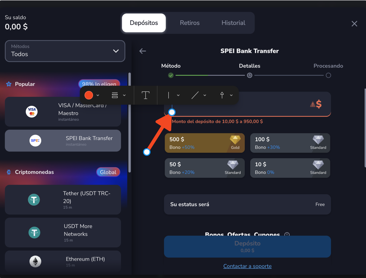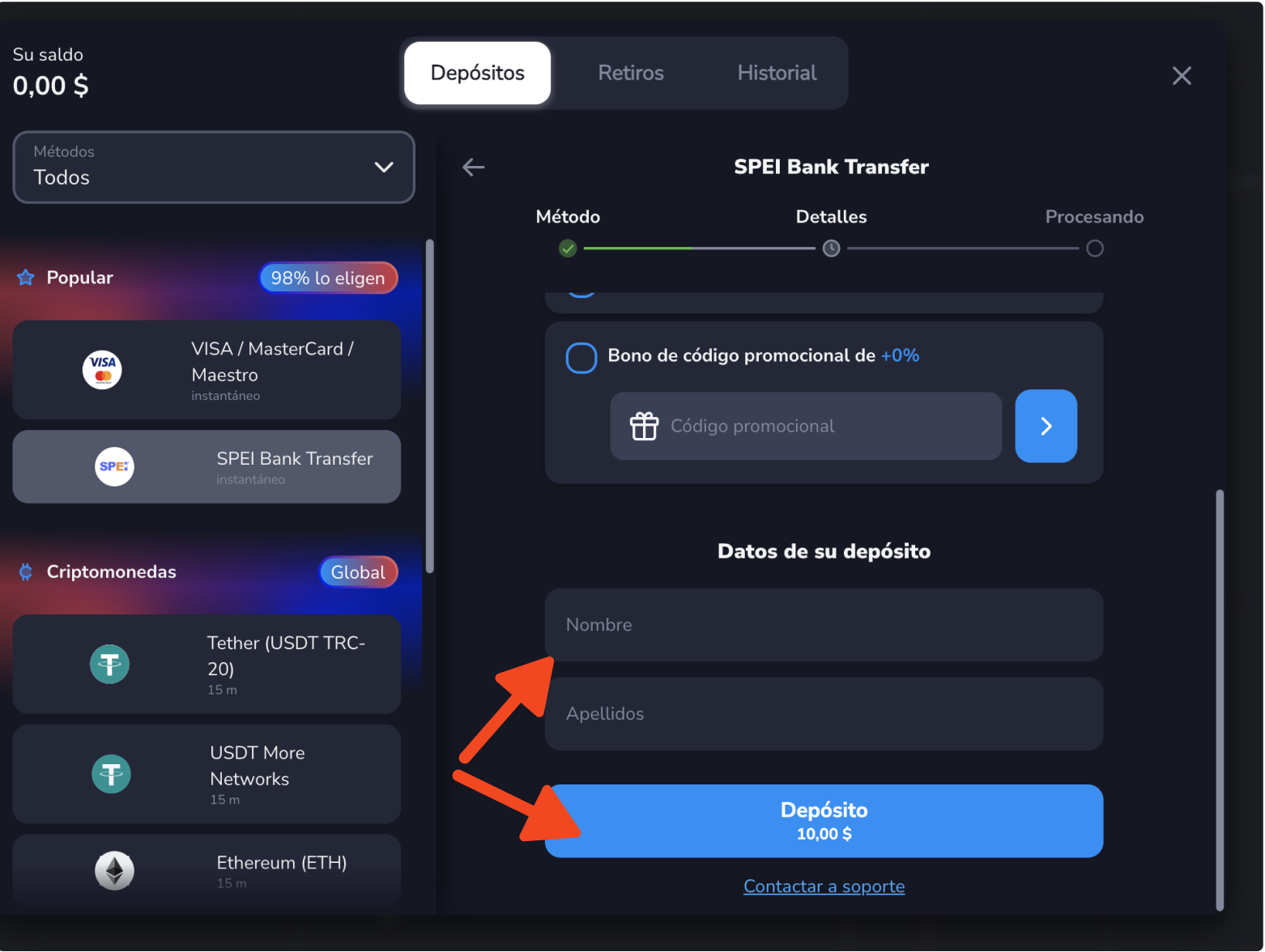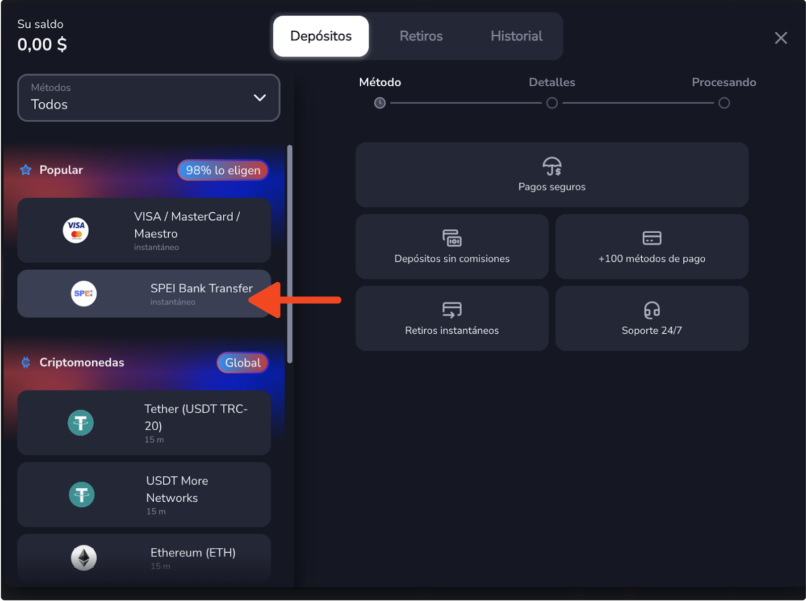 1. En la sala de trading, abra "Depositar fondos" y elija el método de pago "Transferencia SPEI".