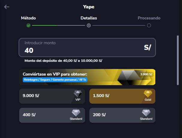 Paso 3: En el campo "Introducir monto" escriba el importe que desea depositar y luego complete los demás datos solicitados (correo, teléfono, referencia, etc.) tal como aparecen en las dos pantallas siguientes. Confirme que el monto cumple con mínimos y posibles comisiones.