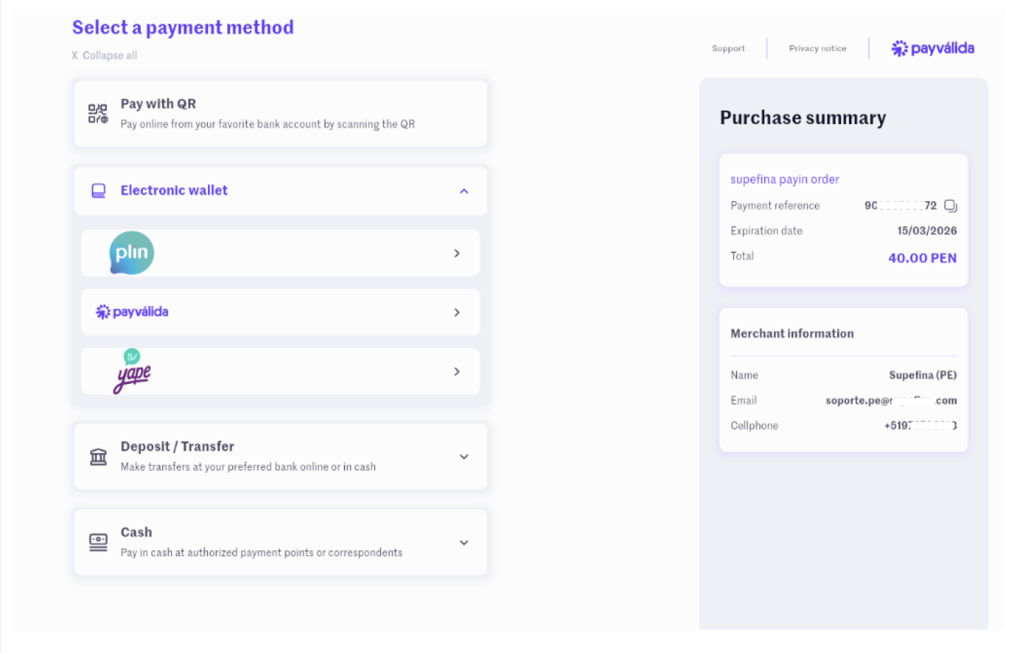 5. Paso 5: Abra “Electronic wallet” y, dentro de las opciones disponibles, seleccione nuevamente Yape; se desplegará la pantalla que inicia el flujo de pago hacia Yape. Verifique que la referencia o número de requerimiento se muestre correctamente.