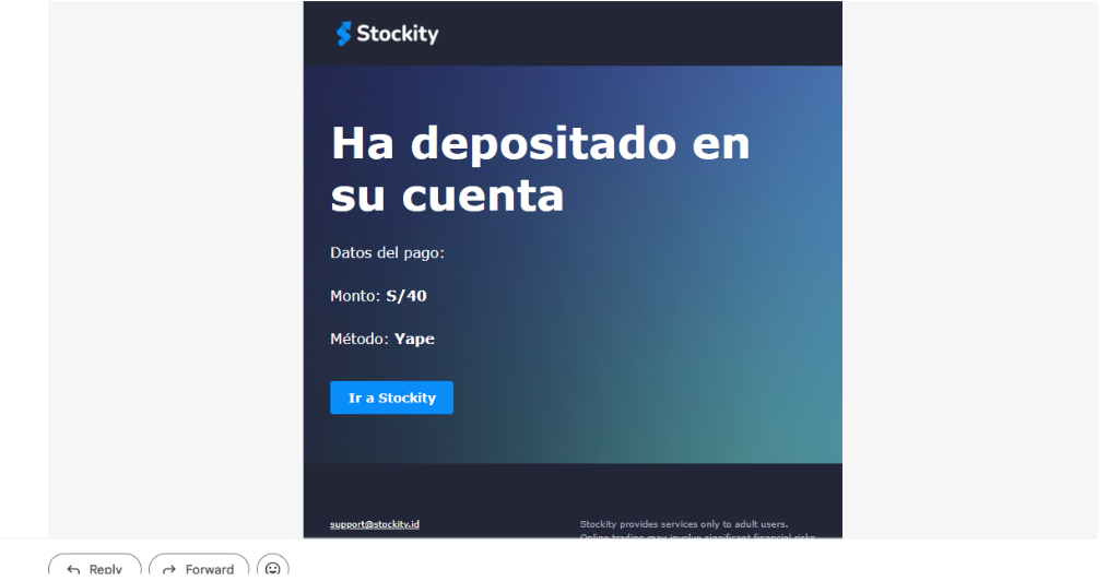 Paso 11: La confirmación del depósito también llegará por correo electrónico a la dirección registrada en Stockity. Si no recibe la notificación en un plazo razonable, verifique la carpeta de spam y, si es necesario, contacte al soporte de Stockity adjuntando la captura del comprobante de Yape y los datos del depósito.