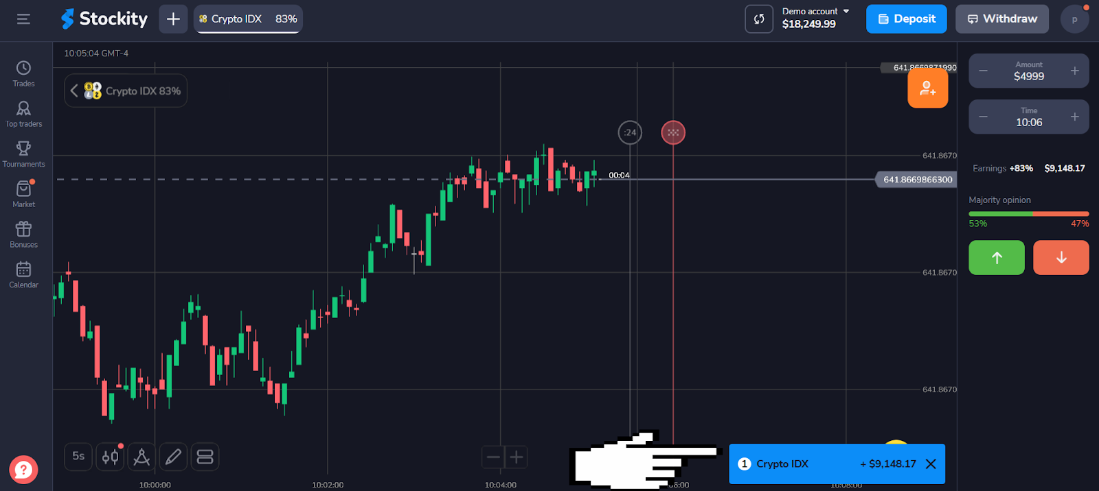 Anda akan menerima notifikasi pop-up yang menampilkan jumlah keuntungan Anda ketika perdagangan ditutup. Jika prediksi Anda benar, maka dana investasi beserta keuntungan dari transaksi tersebut akan dikreditkan ke saldo akun Anda.