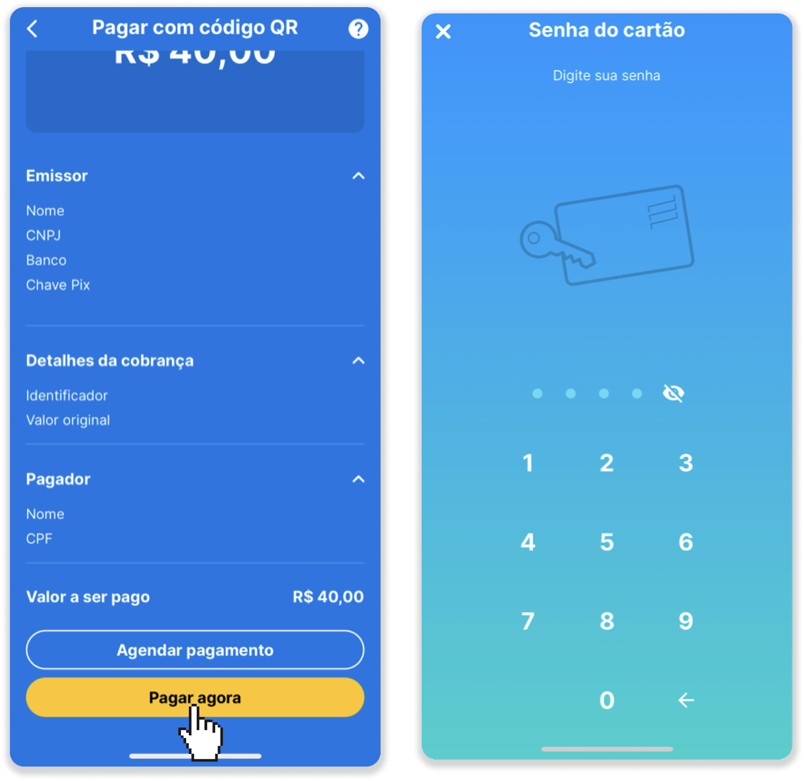 8. Independentemente de ter digitalizado ou colado o código, você será redirecionado para a tela de confirmação. Verifique se todas as informações estão corretas e toque em "Pagar Agora". Digite a senha de 4 dígitos de seu cartão para confirmar o pagamento.