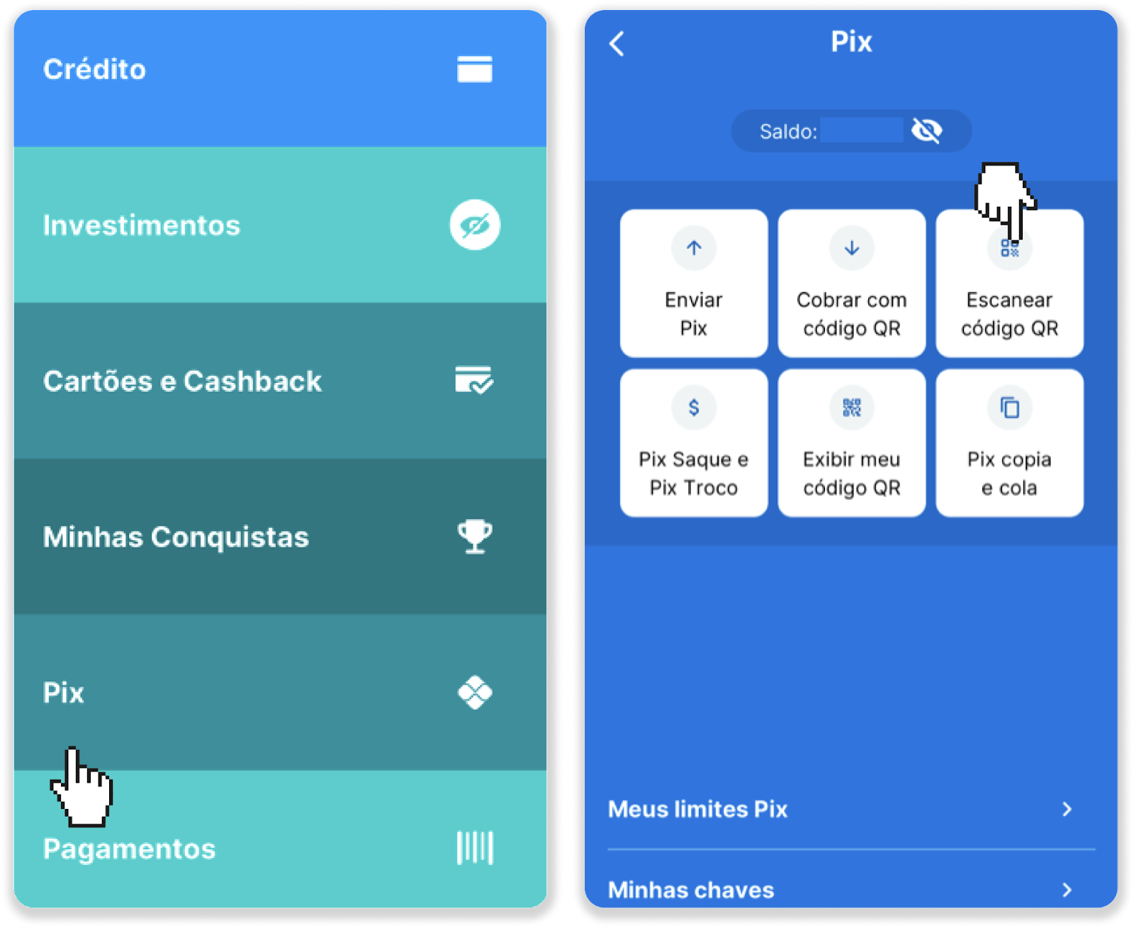 6. Acesse seu aplicativo bancário (estamos usando o Neon) e toque no menu Pix. Para digitalizar o código QR com a câmera, toque em "Escanear Código QR" e aponte a câmera para o código.